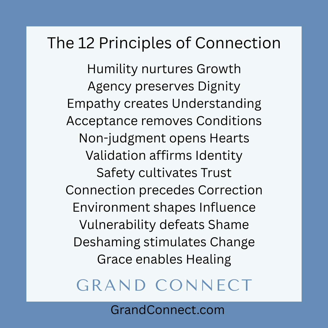 Our principles of connection recognize that healthy grandparenting (and families) begin with inner wholeness, not authority. Principles such as humility, agency, empathy, acceptance, non-judgment, validation, safety, humility, vulnerability, and grace always prevail. With these, connection removes shame and empowers change.